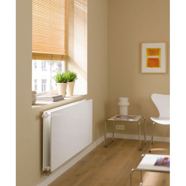 Радиатор с абсолютно гладкой передней панелью, из листовой стали. Подходит для быстрой, легкой и удобной уборки, а также для создания климата без содержания пыли в соответствии со специальными гигиеническими требованиями, предъявляемыми в лечебных заведениях. Радиатор подходит для одно- и двухтрубных систем, имеет боковое подключение - правое или левое. В работе радиатора используется уникальный, запатентованный принцип Therm X2, основанный на последовательной обвязки по теплоносителю. При этом теплоноситель из подающего трубопровода сначала поступает в переднюю панель. В режиме нормальной эксплуатации мощности передней панели обычно достаточно, а задняя панель выполняет функцию отражающего экрана. Лишь когда требуется большая мощность, в дело вступает задняя панель и, благодаря своим конвекционным свойствам, способствует быстрому нагреву помещения. Основная сфера использования панельных радиаторов — индивидуальные дома и многоквартирные дома с поквартирным отоплением.