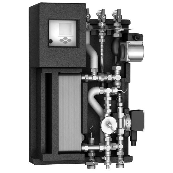 Комплект поставки: монтажная плата с шиной для подключения арматуры, паяный теплообменник из нержавеющей стали (в блочной термоизоляции), насос первичного контура Wilo Yonos PARA 15/7, воздухоспускные пробки в отопительной части станции, обратный клапан, электронный блок управления станции с внешними датчиками, ЕРР-теплоизоляция. Внутренние соединения станции – гофрированная труба из нержавеющей стали DN 16 в теплоизоляции. Фитинги – латунь. Габаритные размеры (с внешним кожухом): В 660 х Ш 455 х Г 215. Дополнительно к ME 10270.3 установлен узел циркуляции горячей воды (насос WILO Star Z Nova, обратный клапан, запорный шаровой кран).