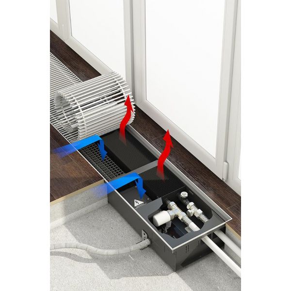 Конвектор Varmann Qtherm Q_230.150.5000, шириной 230 мм, глубиной 150 мм, длиной 5000 мм, EC двигатель 24 В, решетка роликовая, анодированная в цвет светлой бронзы.