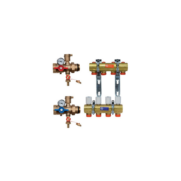 Giacomini Комплект коллекторов с многофункциональными кранами, предварительно собранный. Латунный. Для подключения трубы медной, пластиковой, металлопластиковой, использовать соответствующие адаптеры. C кронштейнами R588 для установки в шкафу R500 (или R588Z для шкафов R500-2).Межосевое расстояние отводов 50 мм.Рабочая температура 5-110°С.Состав:- 1 предварительно собранный коллектор R553D.- 2 многофункциональных крана R269T (содержат две заглушки R592D). Размер 1" x 18 /4